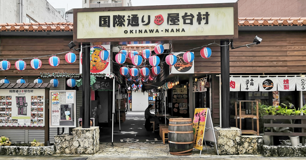 那覇市ぶんかテンブス館の交差点を安里方面にワンブロック歩き、信号のある小道を右に折れると「国際通り屋台村」。21件の飲み屋、そば屋、すし屋、肉料理の店、海鮮の店などが様々な料理店が集まる施設で、那覇市国際通りの元々グランドオリオンという映画館があった跡地に2015年6月にオープンした。今までも那覇には何度も「屋台村」と呼ばれる施設が作られたのだがどこも長続きしなかった。沖縄最大の歓楽街、那覇市「松山」にできた屋台村でさえ10年はもたなかった。しかしこの「国際通り屋台村」はいままでとちょっと様子が違って、平日の朝っぱらからでも呑んでるオヤジはいるし、夕方になるとすでに満席といった盛況ぶり。見た目とは違いちゃんとコンセプトもたてて運営しているので息が長いかも知れない。那覇国際通りの新しい夜のスポットになっている。